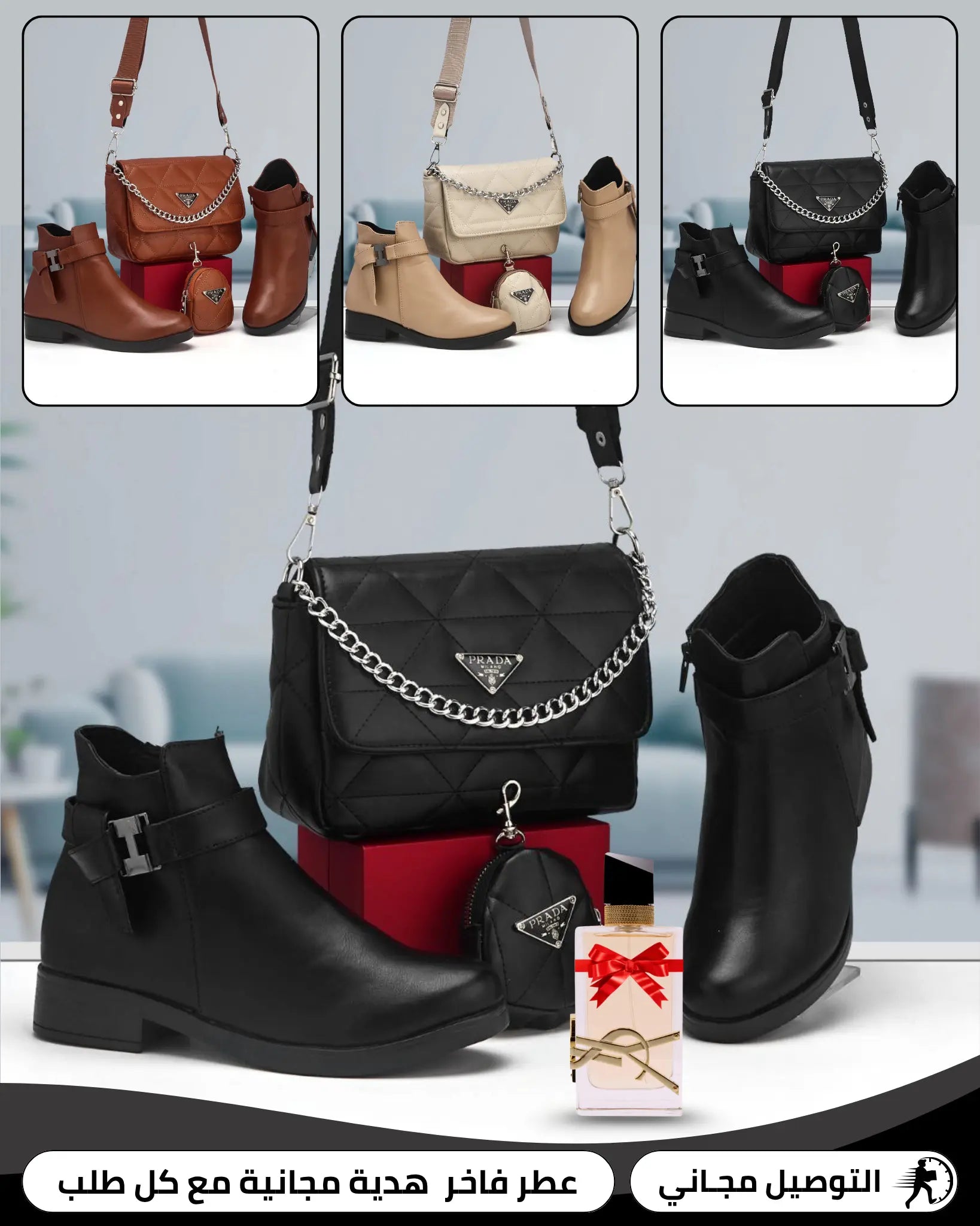 الباقة فيها صباط وصاك بنفس اللون ، ومعاهم عطر هدية مجانية